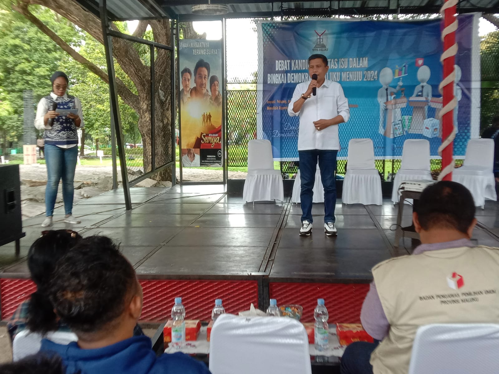 AMBON,KilasMaluku.- Penjabat Walikota Ambon Boedewin Melkias Wattimena, menghadiri debat kandidat lintas isu dalam bingkai demokrasi Maluku menuju 2024 di Kota Ambon, dengan tema “Inovasi dan tantangan Menelisik Kepentingan Orang Muda Dalam Pemilihan Legislatif Di Maluku”, yang berlangsung di Pattimura Park. Sabtu (16/12/2023).
