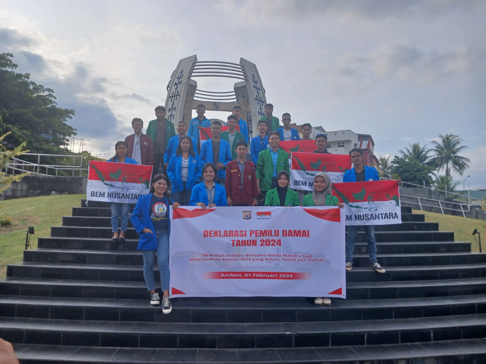 AMBON,KM.–Puluhan Aliansi mahasiswa yang tergabung dalam orgasnisasi Badan Esksekutif (BEM) Nusanta Maluku menyelenggarakan deklarasi Pemilihan Umum (Pemilu) serentak tahun 2024 bersama Polda Maluku siap mewujudkan Pemilu aman, tertib dan damai”, yang berlangsung di Gong Perdamaian Dunia, Kota Ambon. Kamis (1/2/204).