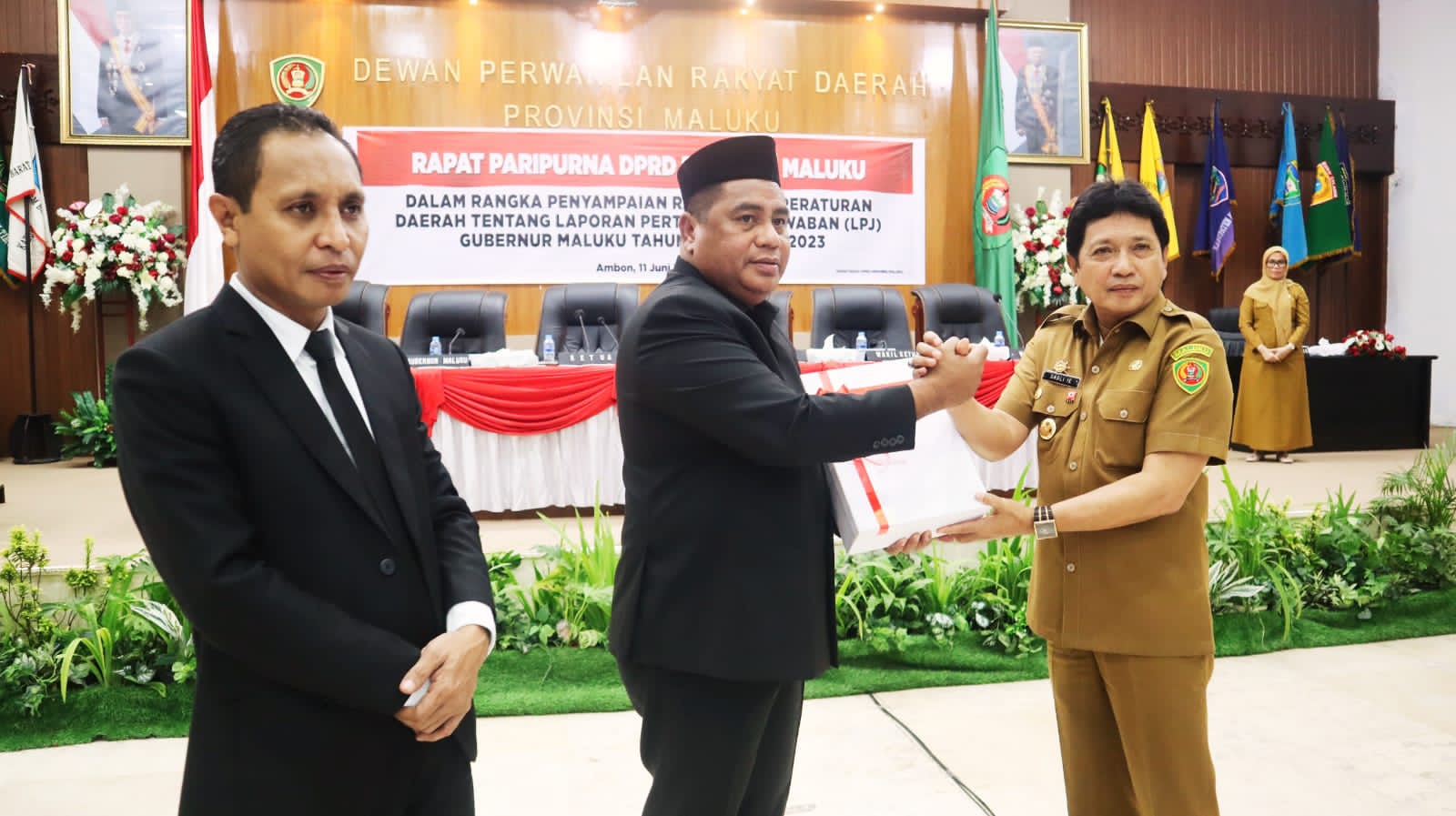 Usai rapat tersebut dilanjutkan dengan penyerahan rancangan peraturan daerah Provinsi Maluku tentang LPJ pelaksaan APBD tahun anggaran 2023, oleh Penjabat Gunernur Sadali le kepada ketua DPRD Maluku, Benhur G Watubun yang didampingi Wakil ketua, Melkianus Sairdekut. (KM02)