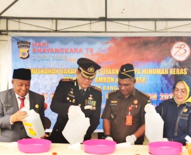 Ribuan liter Minuman Keras (Miras) jenis sopi dimusnahkan oleh Kapolresta Kombes Dryano Andri Ibrahim, didampingi Ketua DPRD Kota Ambon, Ely Toisuta, Dandim 1508 Kolonel Inf Leo Sinaga.