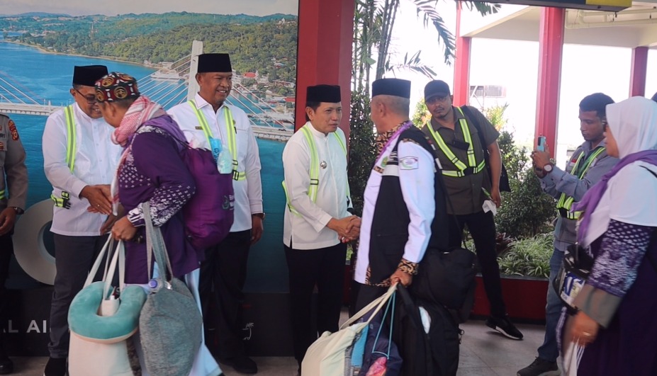 AMBON, KM– Tiba di tanah Air dan kembali ke daerah masing-masing. Jemaah haji asal Maluku beserta petugas disambut penjabat guburnur Maluku, Sadali Le.