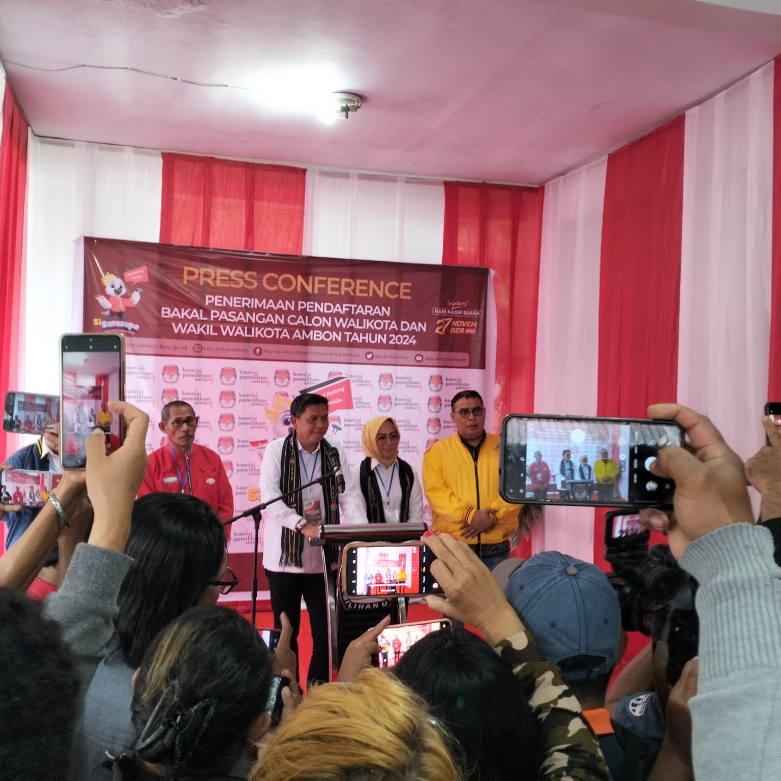 Pukul 12.23 WIT, pasangan Bodewin-Ely bersama rombongan akhirnya tiba di KPU. Kehadiran bodewin-Ely disambut langsung Ketua KPU Kota Ambon, Kaharuddin Mahmud dan Komisianer lainnya.