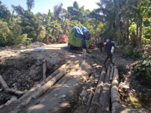 “Jembatan darurat yang dibuat agak ke samping, dan kondisi jalan berlumpur hingga tekanan berat mobil kandas akibat lumpur tebal tutupi sebagian besar badan jalan” ungkap, Raul salah satu pengendara, kepada Kilasmaluku.id, Minggu