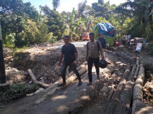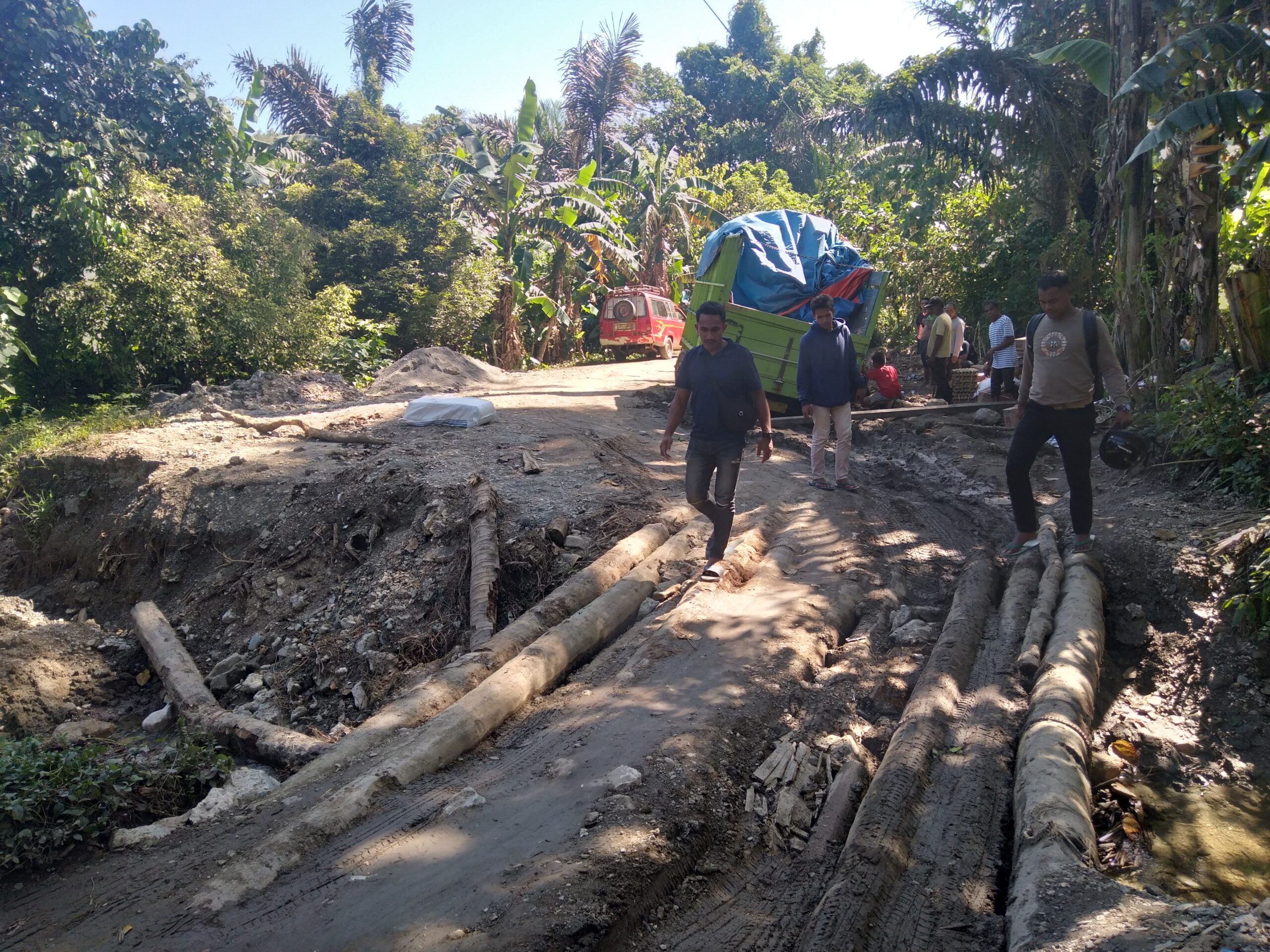 Agar bisa dilewati para pengendara, masyarakat setempat berinisiatif membuat jembatan darurat dengan menggunakan batang kelapa yang ditimbun pasir dan kerikil.