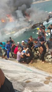 Sebagian penumpang terpaksa loncat kelaut guna menyelamatkan diri. Warga terlihat beramai-ramai melakukan pertolongan terhadap para penumpang.