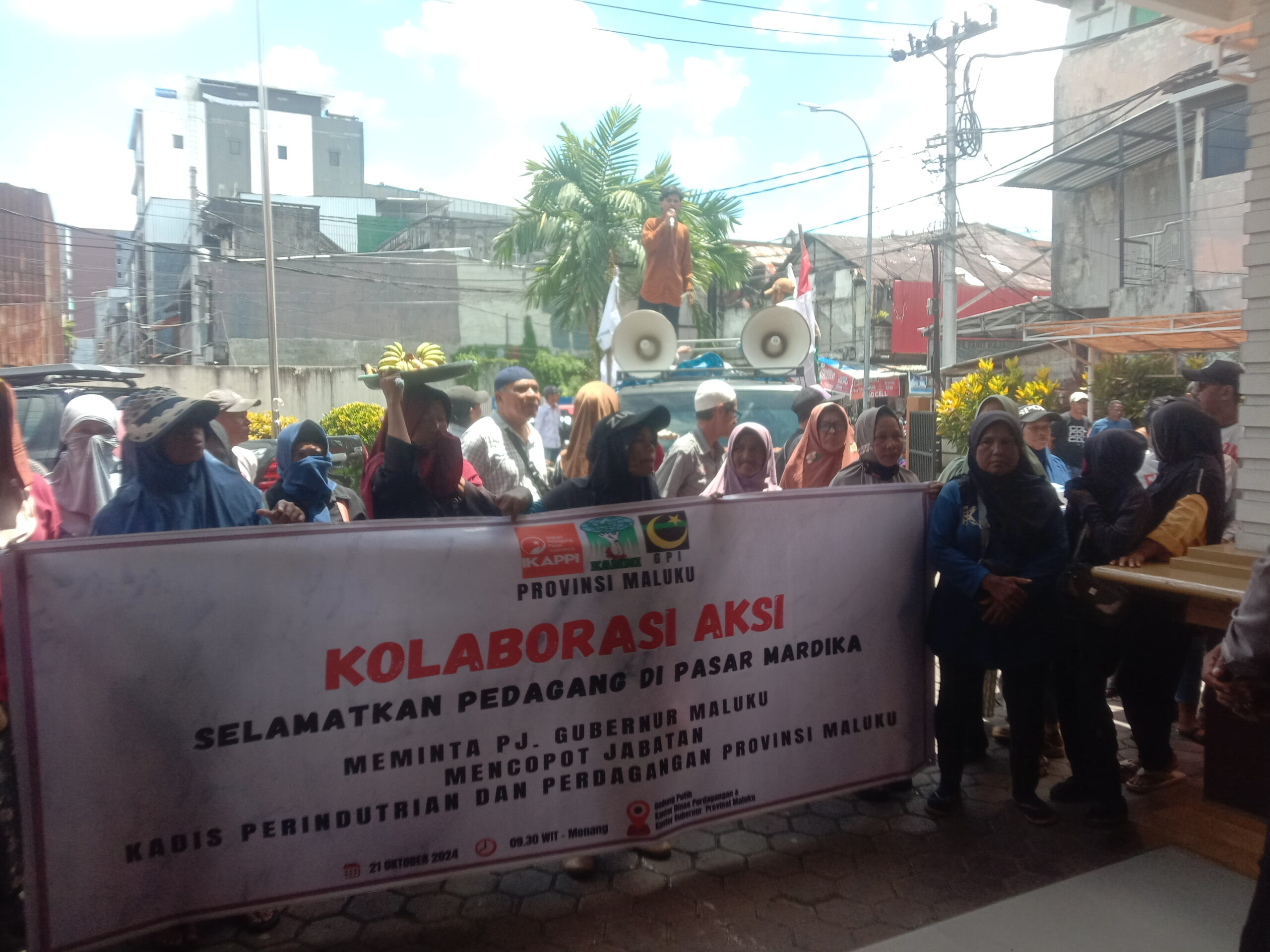” Kami meminta kepada Penjabat Gubernur Maluku, Sadali le untuk segera mencopot Kadis Indag Yahya Kotta dari jabatannya saat ini,” teriak masa aksi dalam orasinya.