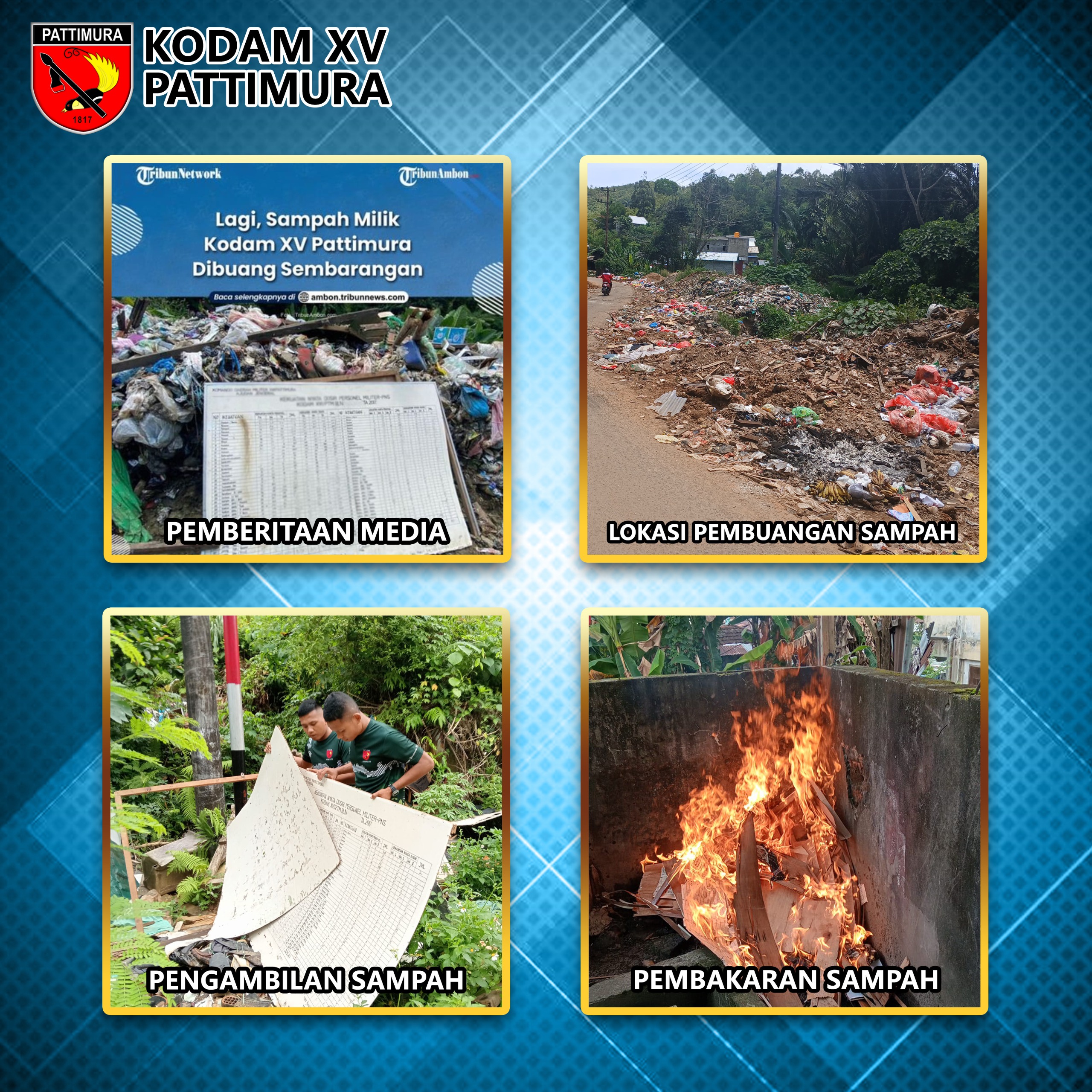 Kapendam mengaku, sampah yang di buang di tempat tersebut merupakan pertama kalinya di lakukan oleh oknum anggota. Selama ini Kodam XV/Pattimura sangat peduli dengan sampah, aksi pembersihan sampah juga sering di lakukan oleh satuan jajaran Kodam untuk membantu pemerintah daerah, bukan hanya pembersihan di pemukiman, pasar, namun juga di Sungai hingga Laut/pantai.