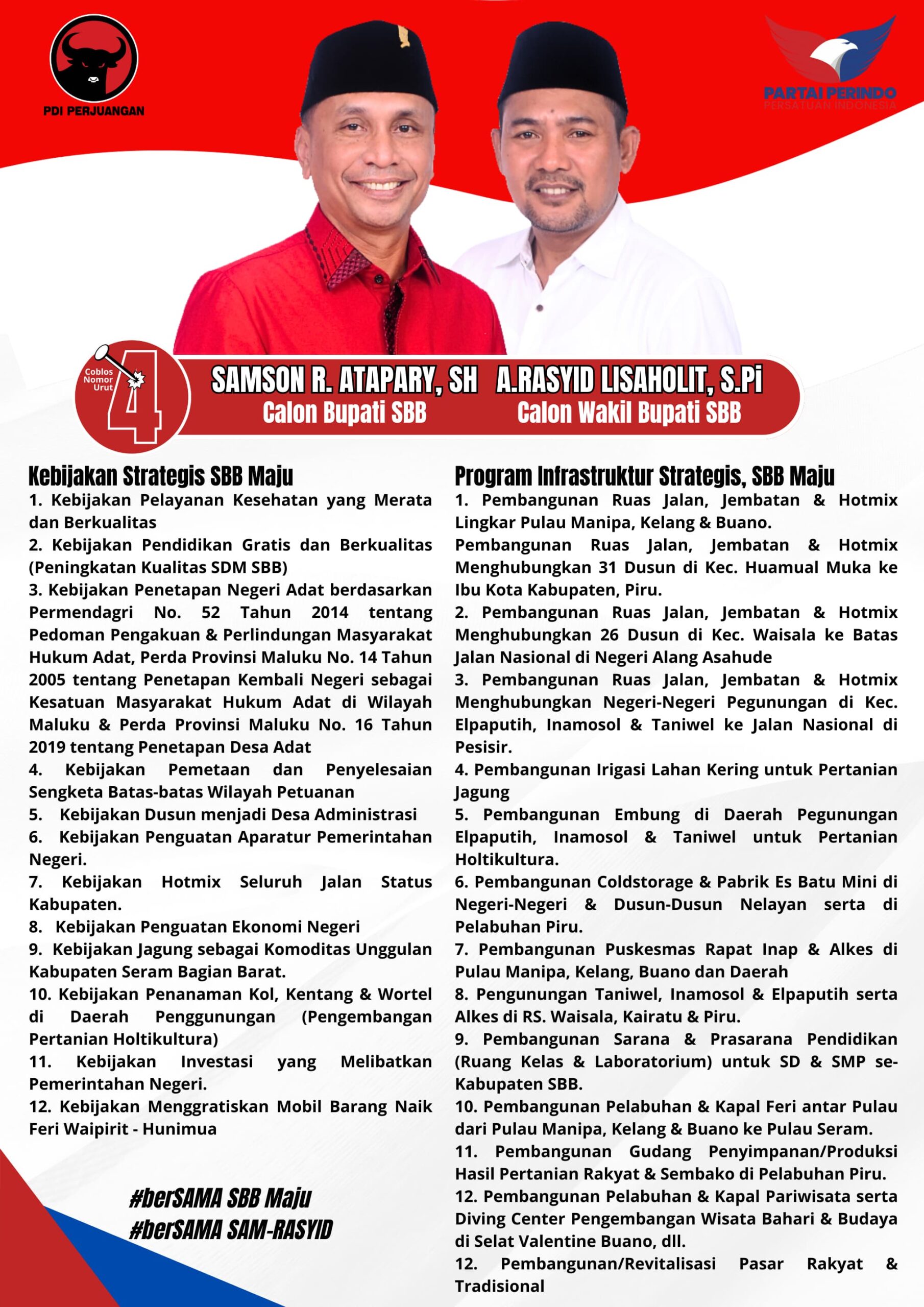 AMBON,KM– Pasangan Calon Bupati dan Wakil Bupati Seram Bagian Barat (SBB) Samson R. Atapary-Abdul Rasyid Lisaholid mendapat tanggapan positif dari sejumlah akademisi lewat “Program Infrastruktur Strategis SBB Maju dan Kebijakan Strategis SBB Maju”