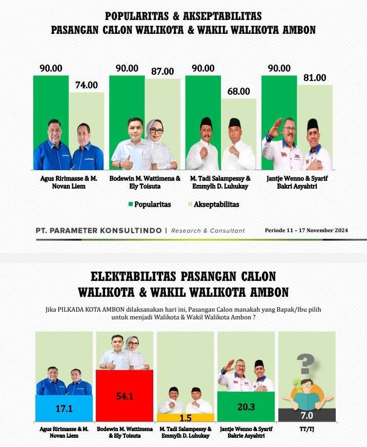 Dari empat paslon calon Walikota-Wakil Walikota Ambon, elektabilitas dan tingkat keterpilihan masih didominati Paslon nomor urut 2 Bodewin Wattimena dan Ely Toisutta yang melambung tiga rivalnya dengan angka 54.1%.