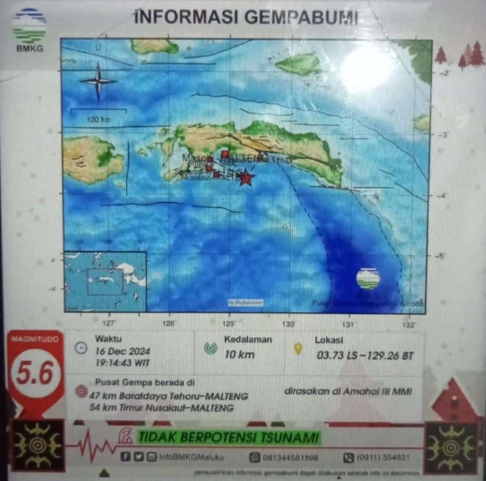 Wilayah tersebut yakni, Kabupaten Maluku Tengah (Malteng), Kota Ambon dan sekitarnya, Provinsi Maluku. Guncanagan ini terjadi, Senin (16/12/2024) sekitar pukul 19.14 WIT.