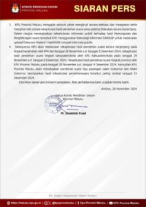 AMBON, KilasMaluku.- Komisi Pemilihan Umum (KPU) Maluku, memastikan penetapan perolehan suara Pasangan Calon (Paslon) Gubernur dan Wakil Gubernur periode 2024-2029, akan berlangsung pada 15 Desember 2024.