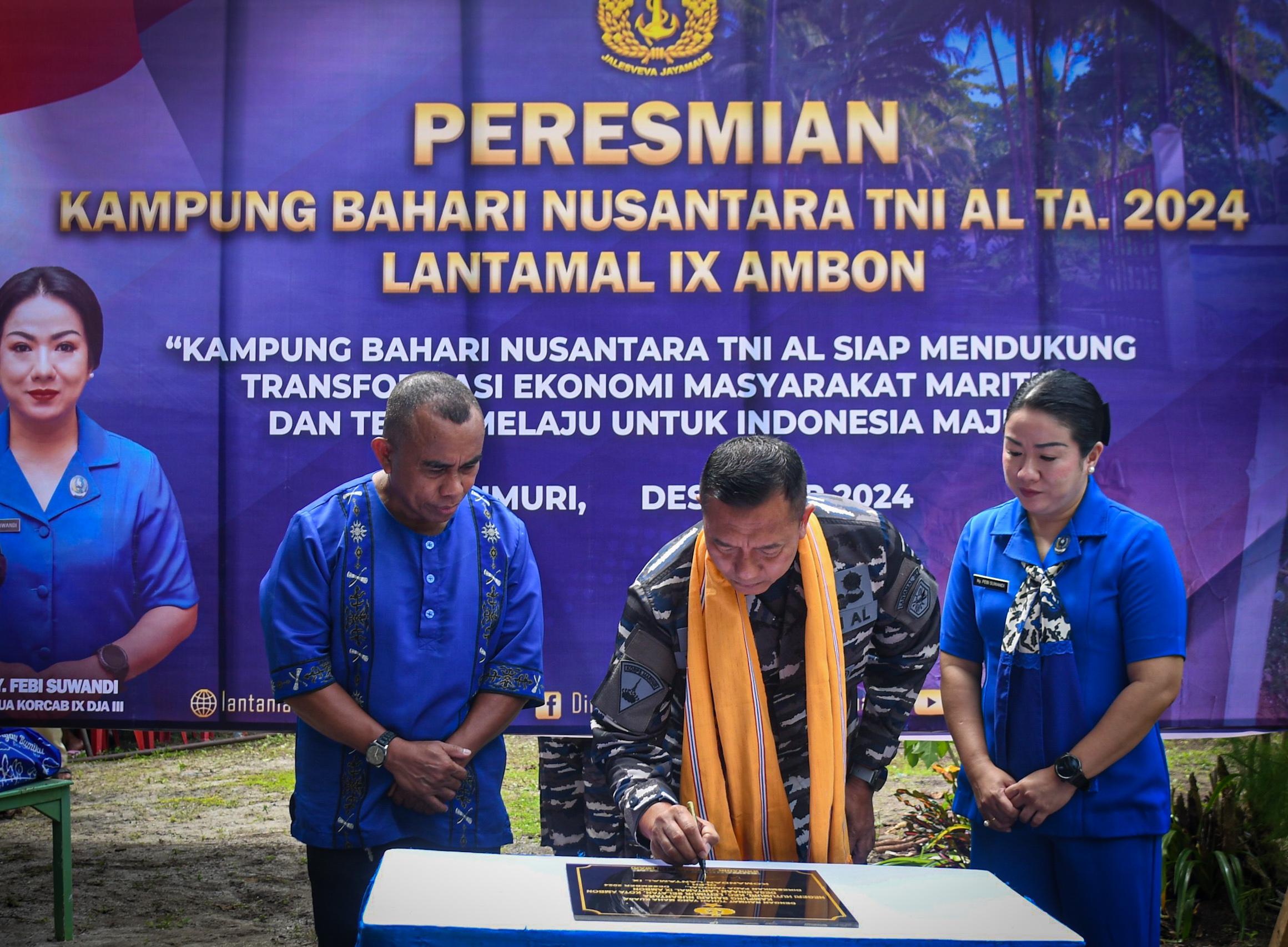 Penandatanganan prasasti peresmian Negeri Hutumuri menjadi KBN, dilakukan oleh Danlantamal IX Ambon, Brigjen Suwandi yang didampingi oleh Aspotmar Danlantamal IX Ambon, Kolonel Laut (PM) Khoirul Fuad, beserta Raja Negeri Hutumuri, sabtu (28/12/24).