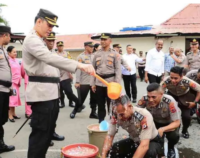 Usai memimpin ucapara, kemudian dilanjutkan dengan melakukan penyiraman air kepada personel yang naik pangkat.
