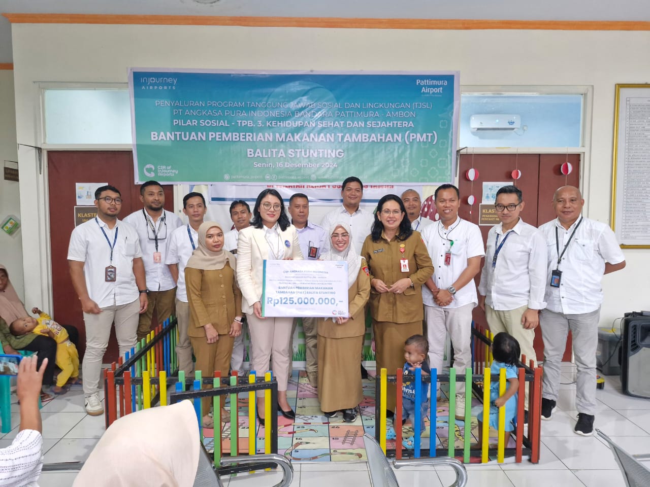 AMBON,KM– PT Angkasa Pura Indonesia Bandar Udara Pattimura Ambon, secara simbolis menyalurkan bantuan sebesar Rp.125.000.000, guna memenuhi makanan tambahan untuk balita stunting. Serta upaya meningkatkan gizi dan kesehatan masyarakat di sekitar area operasional Bandar Udara Pattimura.
