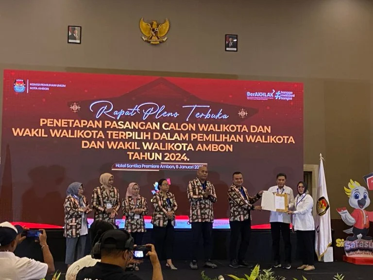 “Berdasarkan SK Nomor 5 Tahun 2025, KPU menetapkan Bodewin Wattimena-Ely Toisuta sebagai Walikota dan Wakil Walikota Ambon Terpilih periode 2025-2030,” ujarnya.