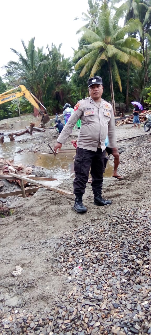 Warga yang mengetahui ambruknya jembatan langsung saling gotong royong membuat jembatan darurat untuk kendaraan yang melintas.