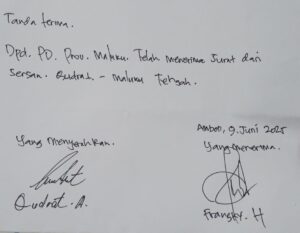 Diketahui, laporan tersebut diserahkan langsung oleh Sera Qudrat dan telah diterima langsung oleh Fangky. H Selaku perwakilan Dewan Pimpinan Daerah (DPD) partai Demokrat Provinsi Maluku.