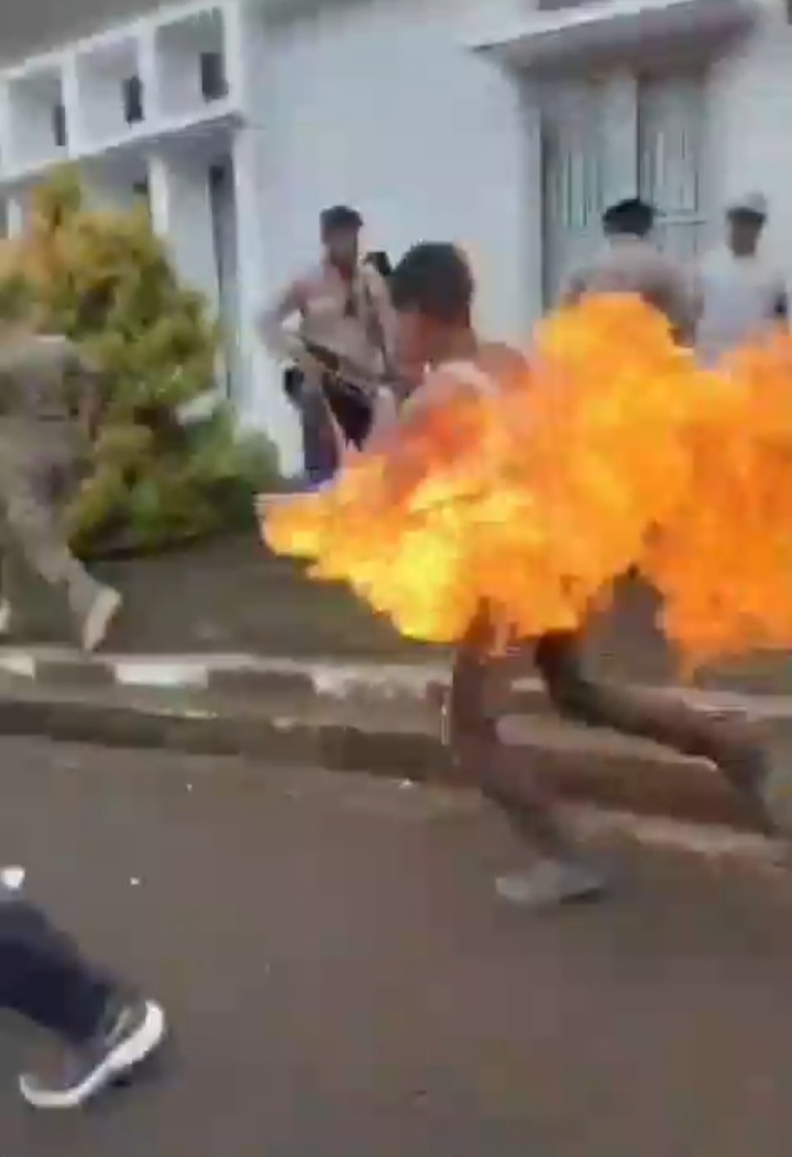 Mereka berusaha padamkan api yang membakar tubuh kedua orang tersebut. Kedua orang itu berlari mencari pertolongan.