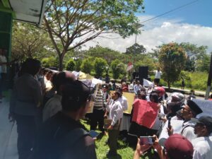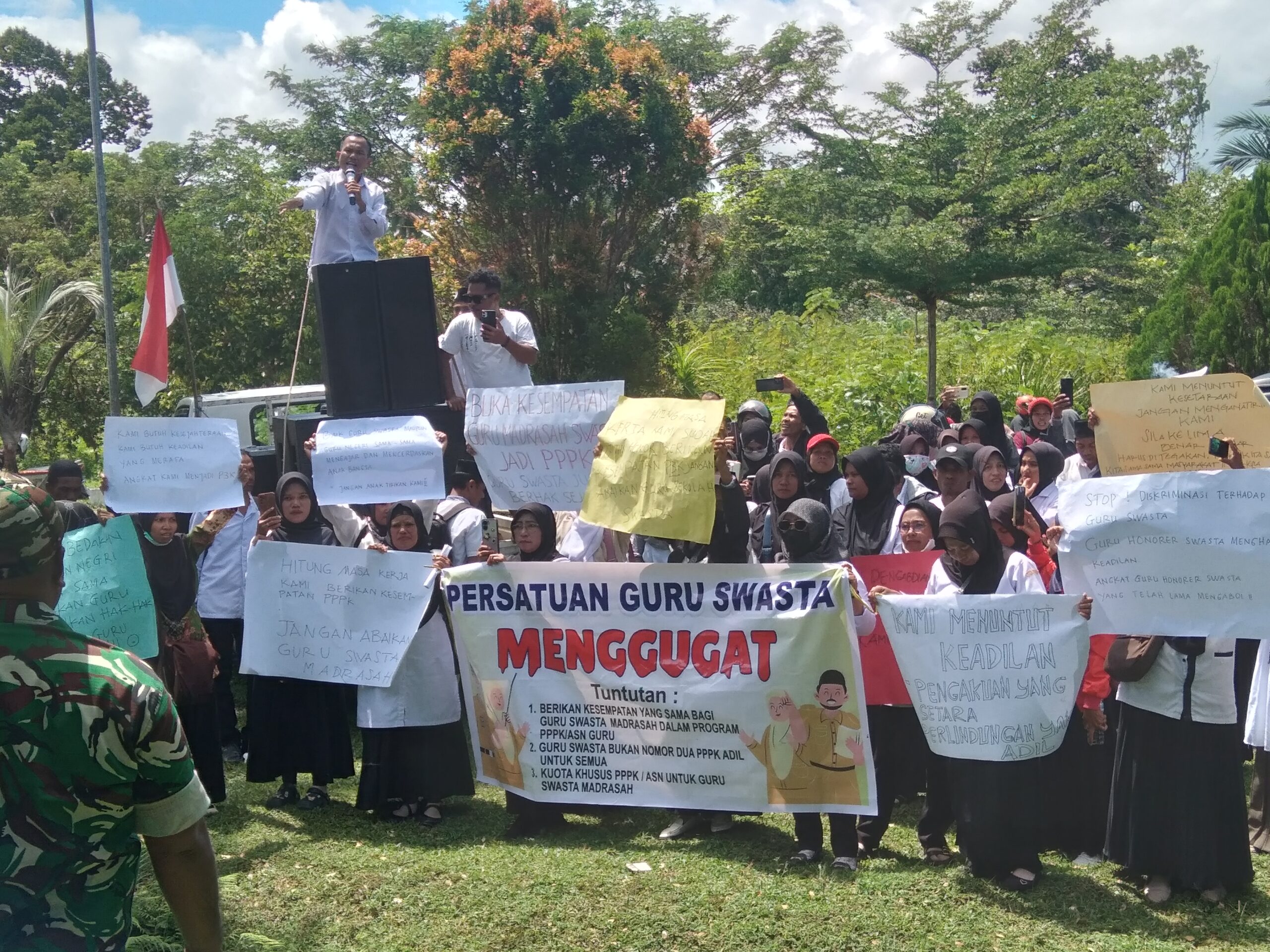 “Kami ratusan guru madrasah se-kabupaten SBB hadir di sini untuk meminta klarifikasi kepala kemenag terkait penerapan seleksi PPPK/ASN ruang lingkup kementerian agama” teriaknya