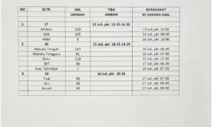 AMBON,KM– Kantor wilayah Kementerian agama Provinsi Maluku menjadwalkan pemulangan jemaah haji asal Maluku. Jemaah Haji Maluku yang terbagi dalam tiga kloter diketahui...