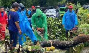 AMBON,KilasMaluku.-Pohon berukuran besar tumbang di kawasan Desa Hunut, Kecamatan Teluk Ambon, Kota Ambon, dan meninpah salah satu tiang kabel milik...